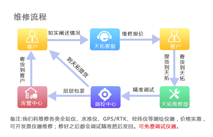 云南天拓測繪有限公司對產品質量和售后服務都嚴格按照國際高標準操作。公司及其技術顧問在收到有關儀器使用技術及維修問題和有關的投訴時,必須立即轉達有關部門,并在24小時內做出處理意見的答復。