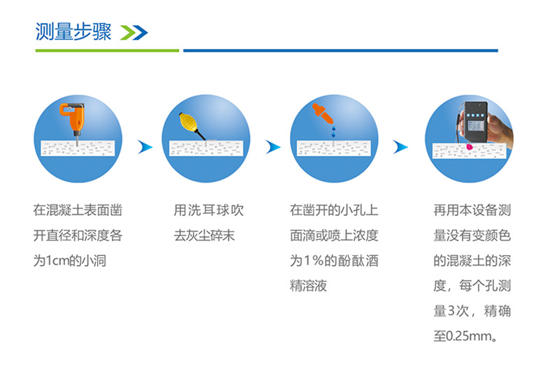 混凝土澆筑成型后,其中的Ca(OH)2與空氣中的CO2或水分中溶的CO2反應(yīng)生成CaCO3而失去堿性的過(guò)程。測(cè)量原理是通過(guò)酚酞溶液遇堿變紅色的特性,測(cè)量碳